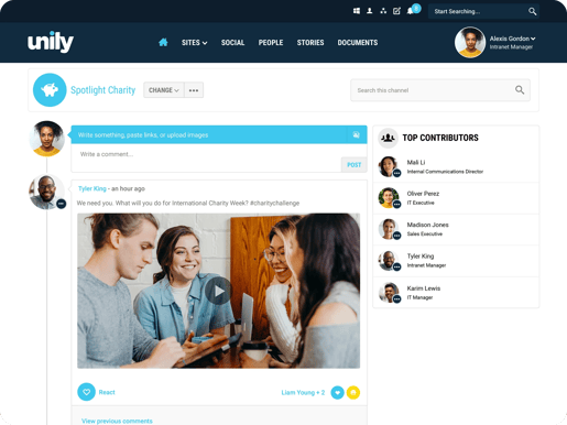 Enterprise social channels have become the de facto communication tool, allowing staff to keep up to date with the latest news and events, create and share initiatives, and collaborate on critical projects. Unily's powerful and flexible employee experience platform empowers people to create multiple social channels for open or private discussions. It is also mobile-friendly so that your people can carry on collaborating from anywhere.