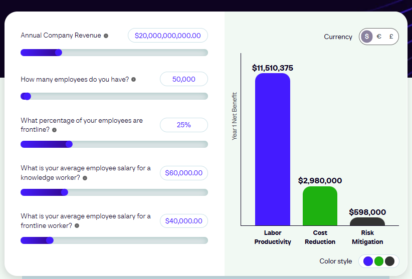Our calculator uses your organization’s data - such as employee counts and salary bands - and applies a blend of industry benchmarks, customer interviews, and Unily’s own research to estimate the potential value of a modern employee experience platform. The methodology is continually refined to ensure projections remain realistic and relevant to evolving business needs.