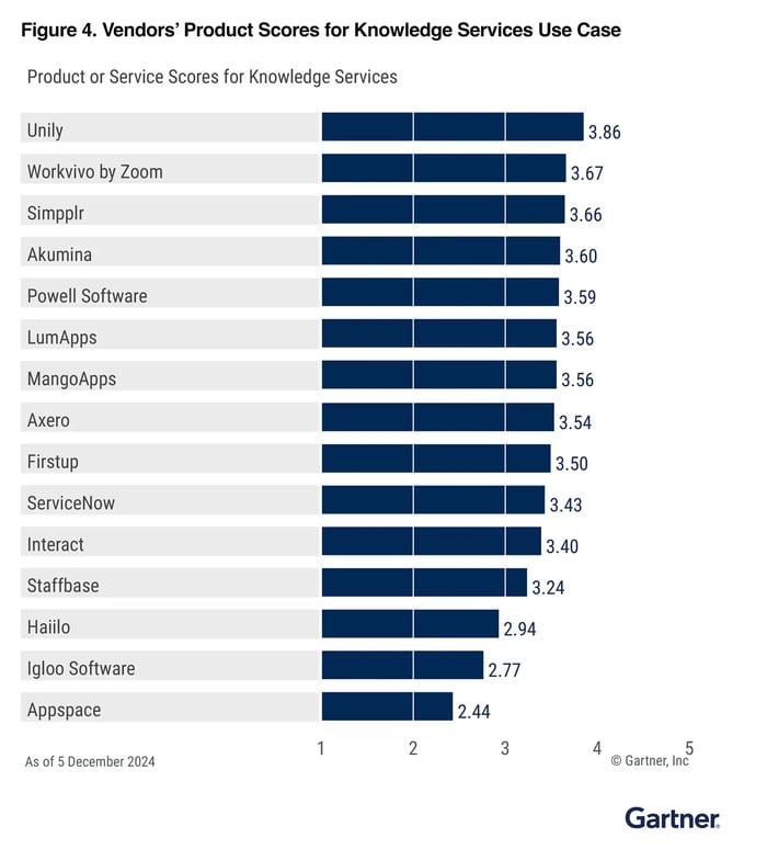 Additionally, the focus on AI Integration (15%) is the highest weighting in AI across all Gartner use cases. The growing role of artificial intelligence in improving knowledge discovery not only democratizes access to knowledge but also automates knowledge creation and enhances search relevance, leading to quicker, more accurate access to information.