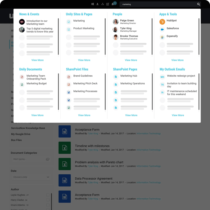 Empowering your employees with quick access to knowledge is one of the most critical services your intranet should provide. A robust search experience that’s intuitive to use and spans all of your repositories helps employees to be more productive and reduces errors caused by misinformation. EXPs elevate search by bringing all of your searchable assets under one roof and surfacing results intuitively. Instead of employees navigating between systems to find the information they need, an EXP lets them search for everything in one place.